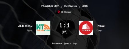 ИТ-Телеком (1:1) Этажи (4:3 по пенальти) 19-10-2025, 18:12 0 1 ⚔️ #ЧемпионатгородасургутаИТ-Телеком - Этажи📆 ⏰ 19 октября / 20:00 📍 СК Дружба (г. Сургут, ул. 50 Лет ВЛКСМ, д. 9А) Комментарии (0) Добавить комментарий Отправить