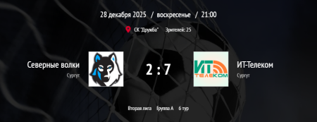 Северные Волки (2:7) ИТ-Телеком 28-12-2025, 08:30 0 8 ⚔️ #Чемпионатгородасургута ИТ-Телеком - Северные волки 📆 ⏰ 28 декабря / 21:00 📍 СК Дружба (г. Сургут, ул. 50 Лет ВЛКСМ, д. 9А) Комментарии (0) Добавить комментарий Отправить